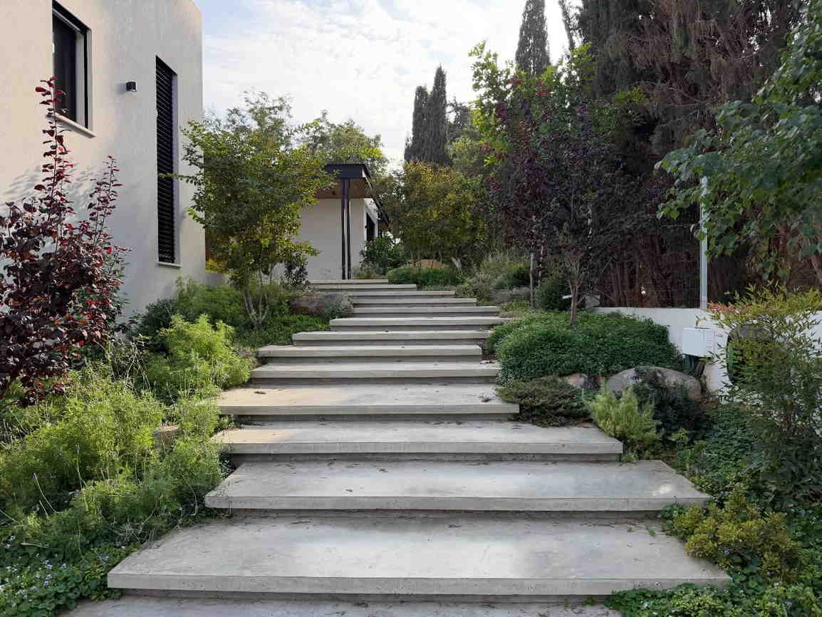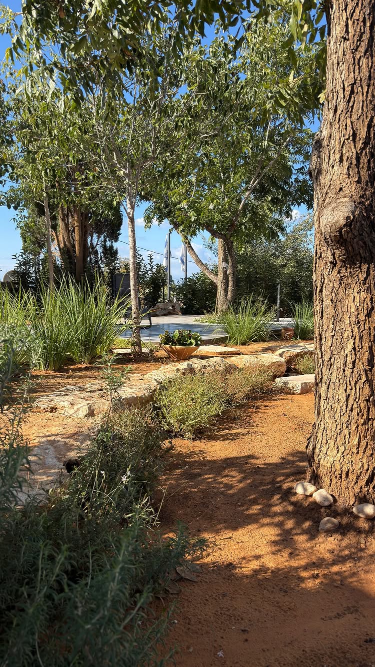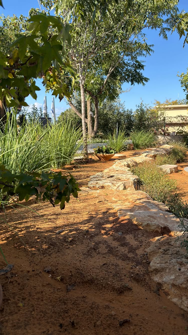 עיצוב שמתאים בדיוק לאקלים שלנו. שימוש רב בחיפויי קרקע כמו טוף וחלוקי נחל, צמחים עמידים ליובש (סוקולנטים, בוגנוויליה) ועצי פרי הדר. זוהי גינה חסכונית במים וקלה לתחזוקה.